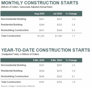 For the 12 months ending August 2025, total construction starts were up 4.7% from the 12 months ending August 2024. Residential starts were down 1.2%, nonresidential starts increased 4.8%, and nonbuilding starts were up 12.1% over the same period.